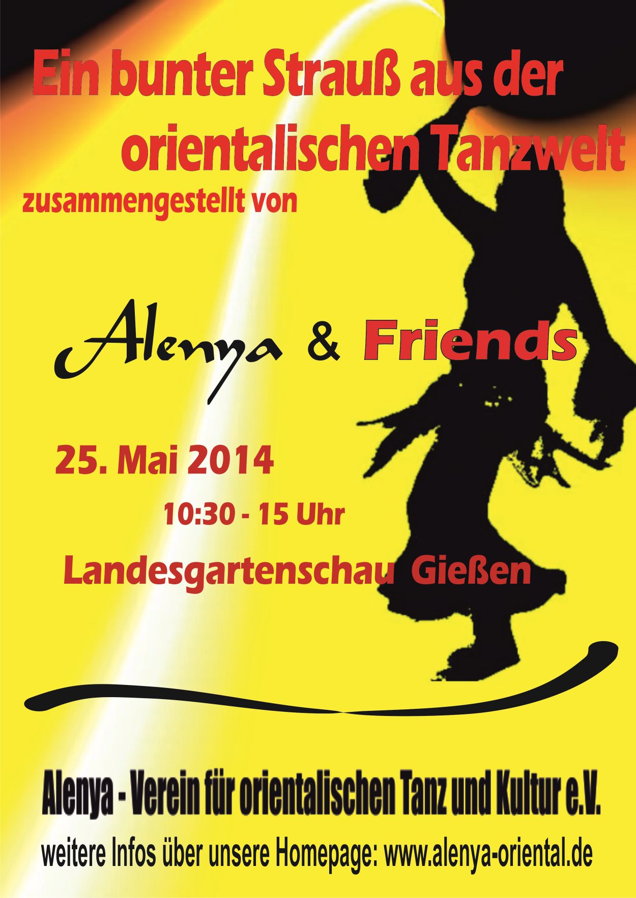 Quer durch die phantastische und farbenprächtige Welt des orientalischen Tanzes entführte „Alenya – Verein für orientalischen Tanz und Kultur e.V.„ (Pohlheim) in Zusammenarbeit mit „Sterne des Orients“ (Bad Nauheim), „Majida“ und ihre Gruppen (Wetzlar, Solms, Gießen) und befreundeten Tänzerinnen und Gruppen.